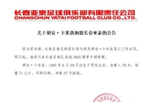 经友好协商,长春亚泰足球俱乐部与球员胡安·卡米洛签订工作合同。即日起,他将代表长春亚泰队征战2025赛季中超联赛。 胡安·卡米洛,1997年6月29日出生于哥伦比亚,身高1.70米,体重71公斤,司职边锋,身披27号战袍。
